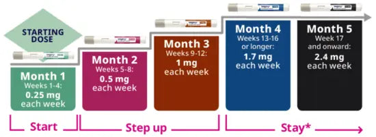 Je start altijd met een lage dosis van 0,25 mg per week. Je lichaam kan zo wennen aan het medicijn. Daarna wordt de dosering stap voor stap verhoogd, meestal om de vier weken. Je arts kiest uiteindelijk een onderhoudsdosering van 1,7 mg of 2,4 mg, afhankelijk van wat het beste bij jou past.